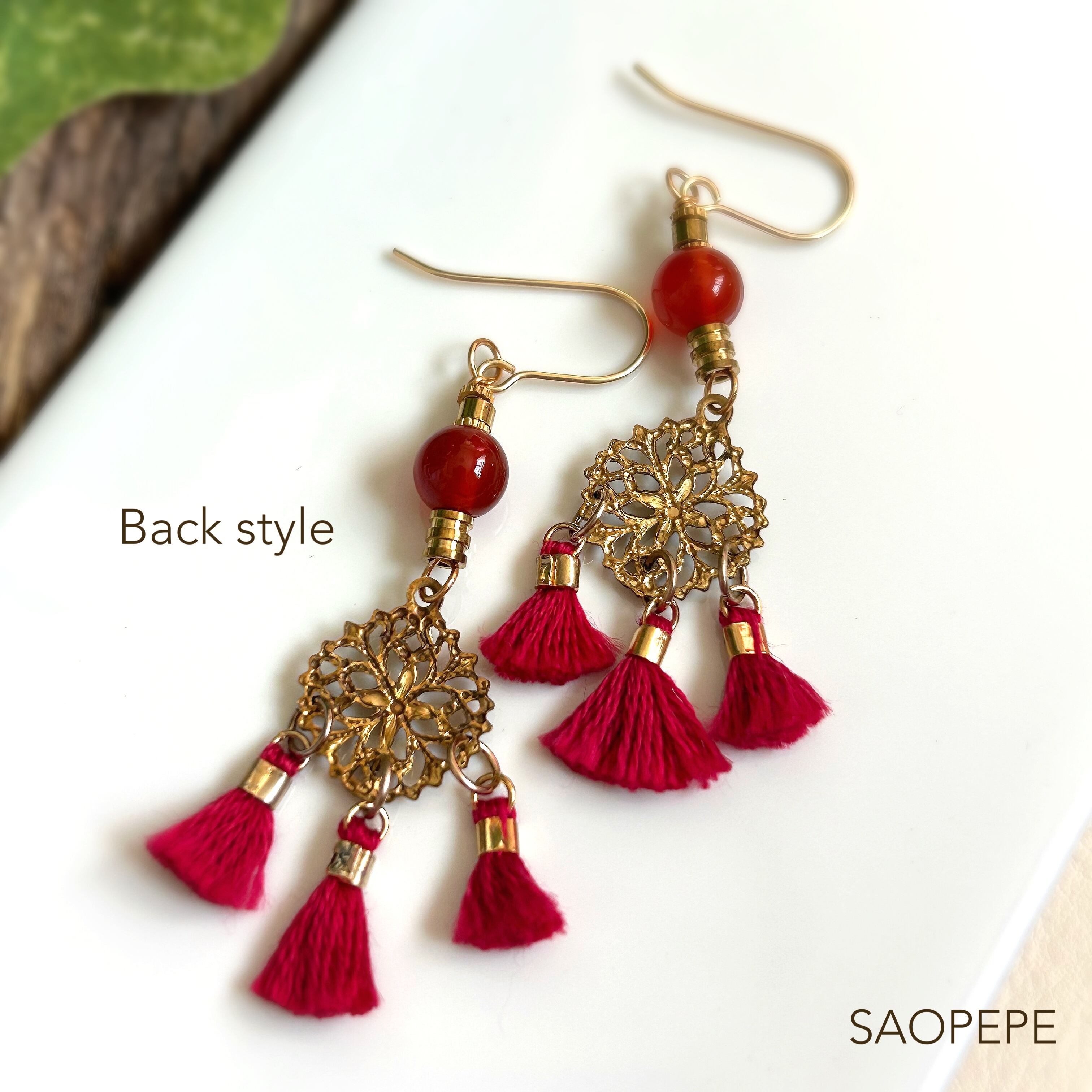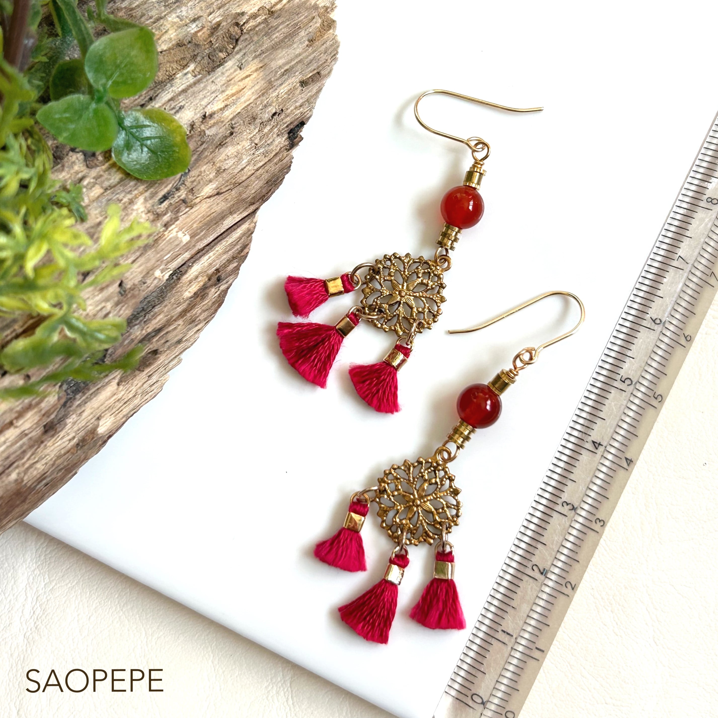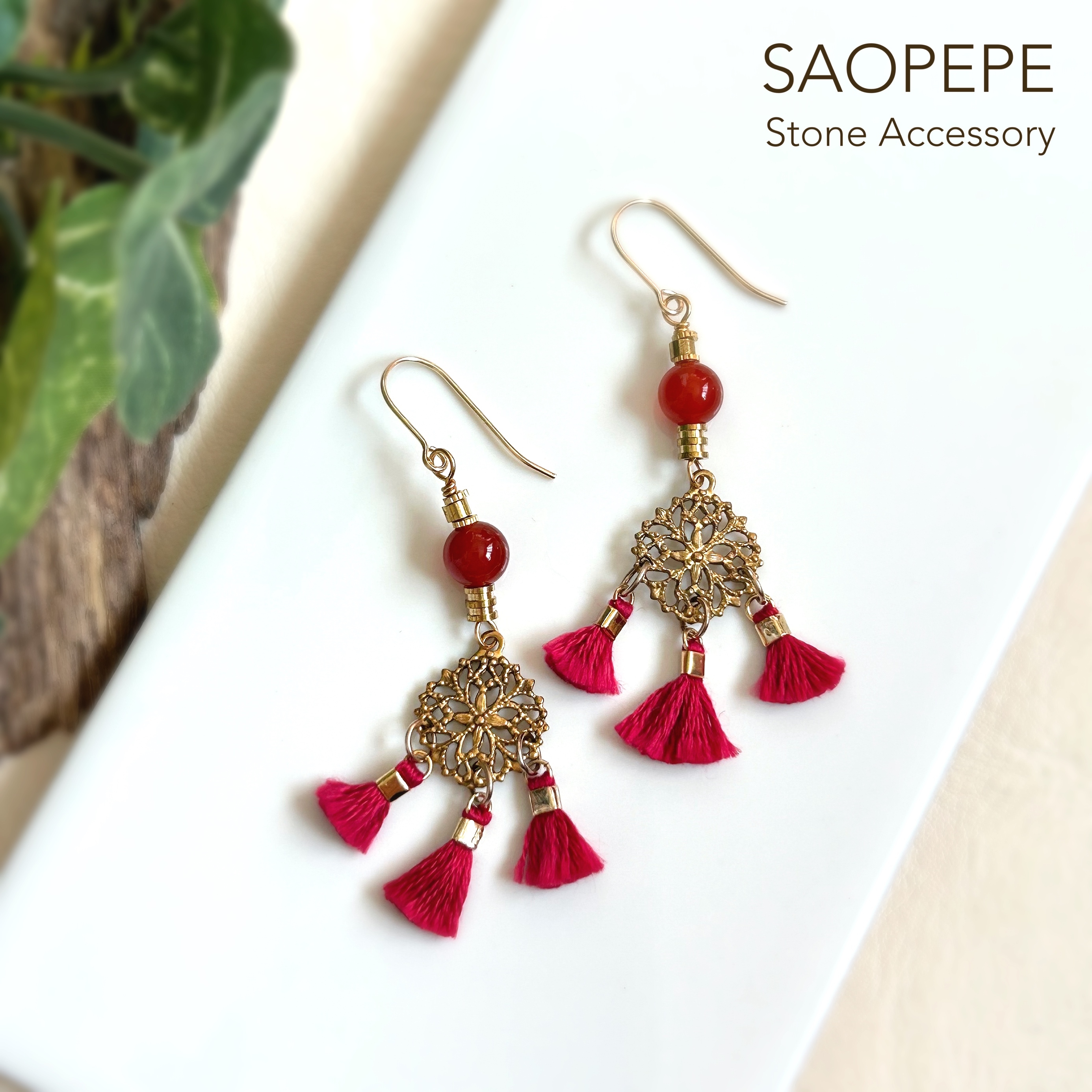 深い紅色カーネリアンとローズレッドミニタッセルがゆらゆらとSwingするピアスです。