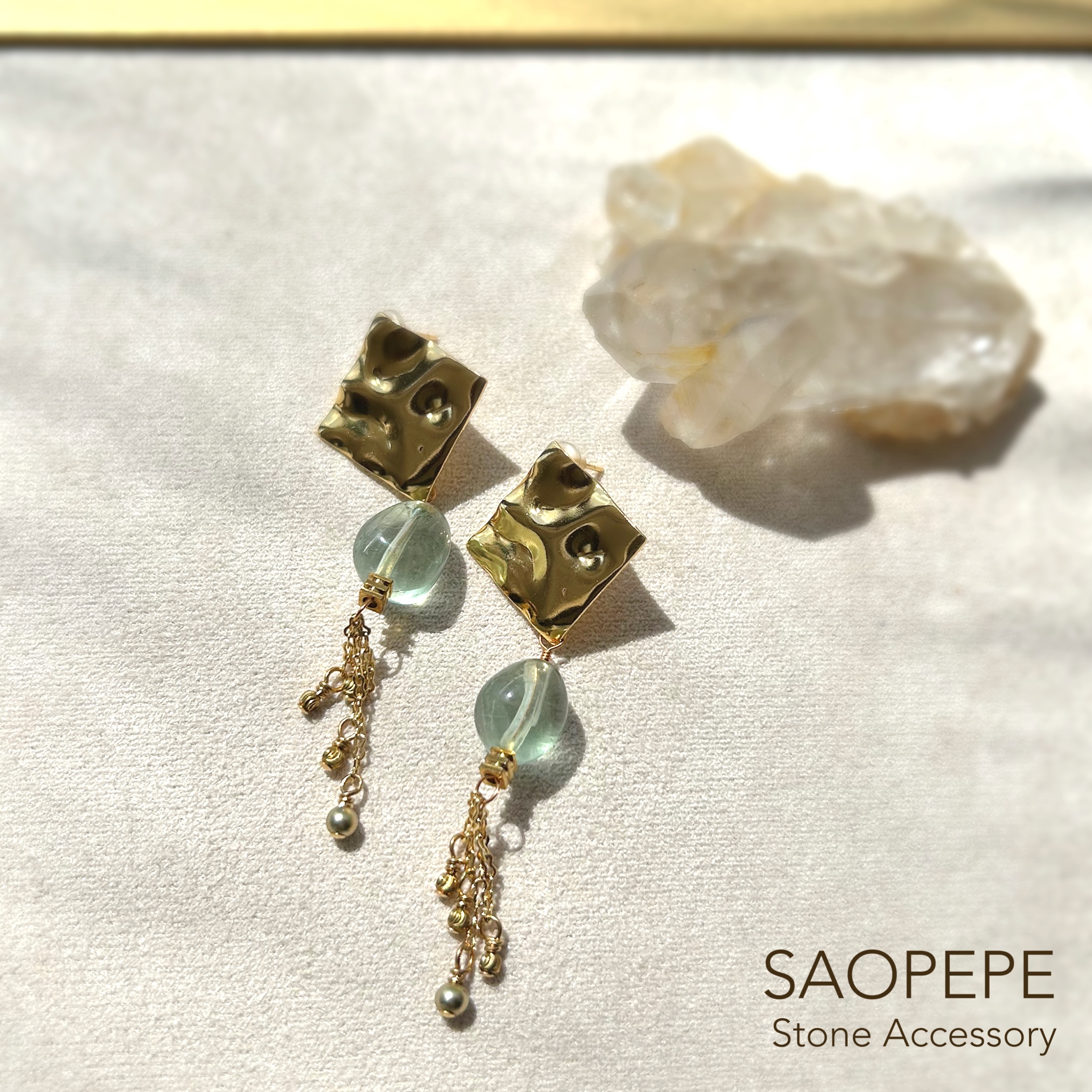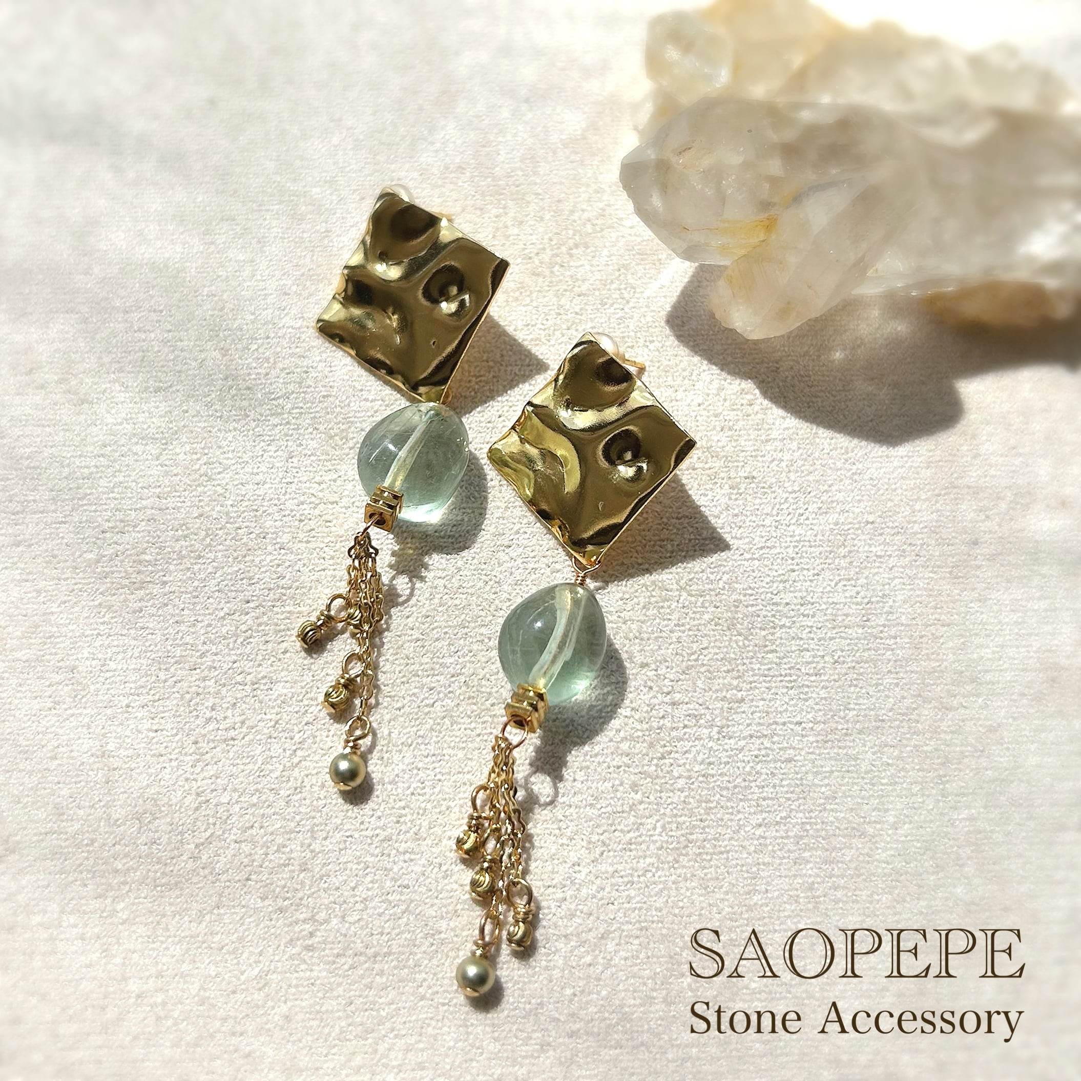 水面のような凹凸がキラキラ光を集めるピアスポストとフローライトの下には、ゴールドカラーの繊細チェーンとビーズがゆらゆら…