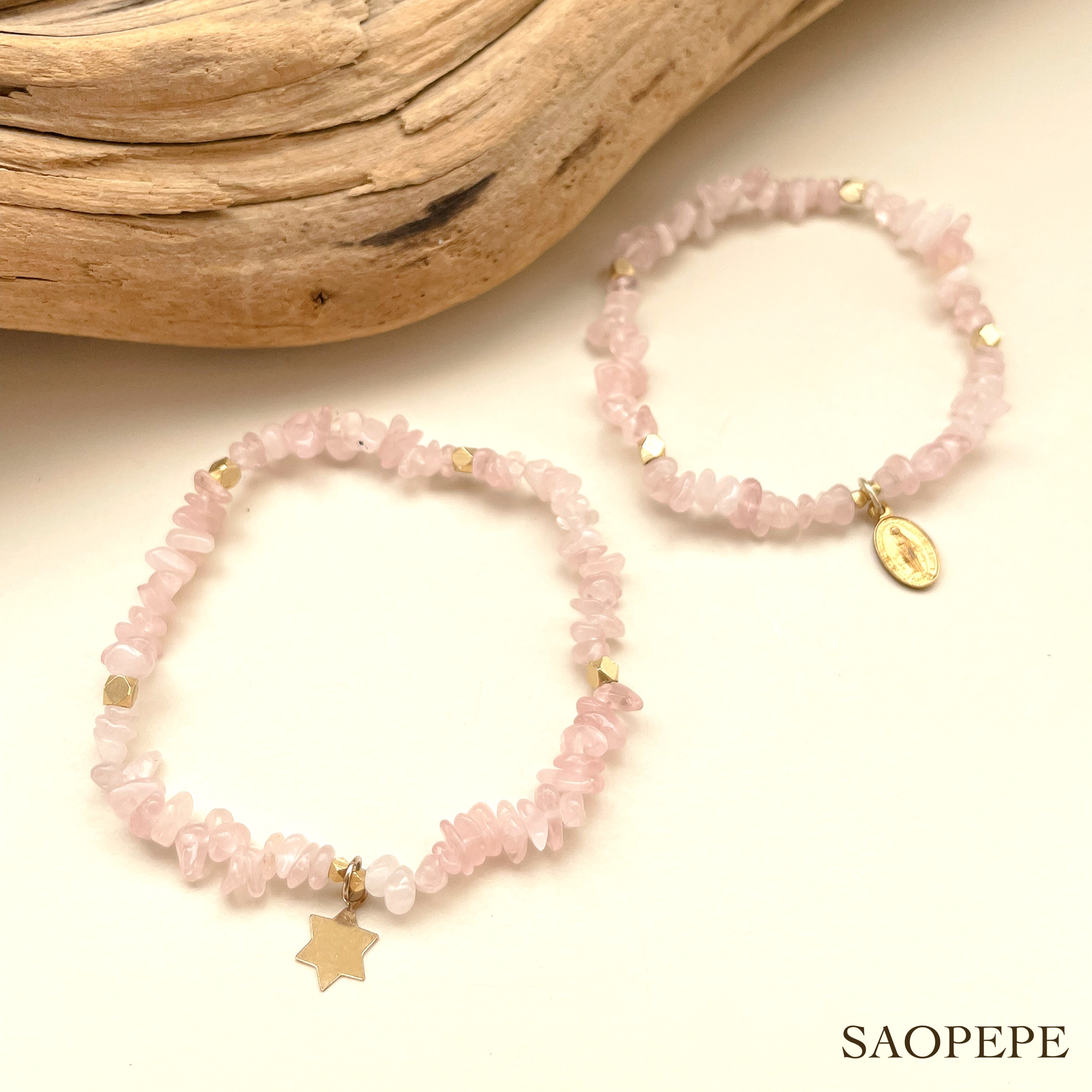 Deep ROSE QUARTZ ○PEBBLEブレスレット(with ミニメダイ)