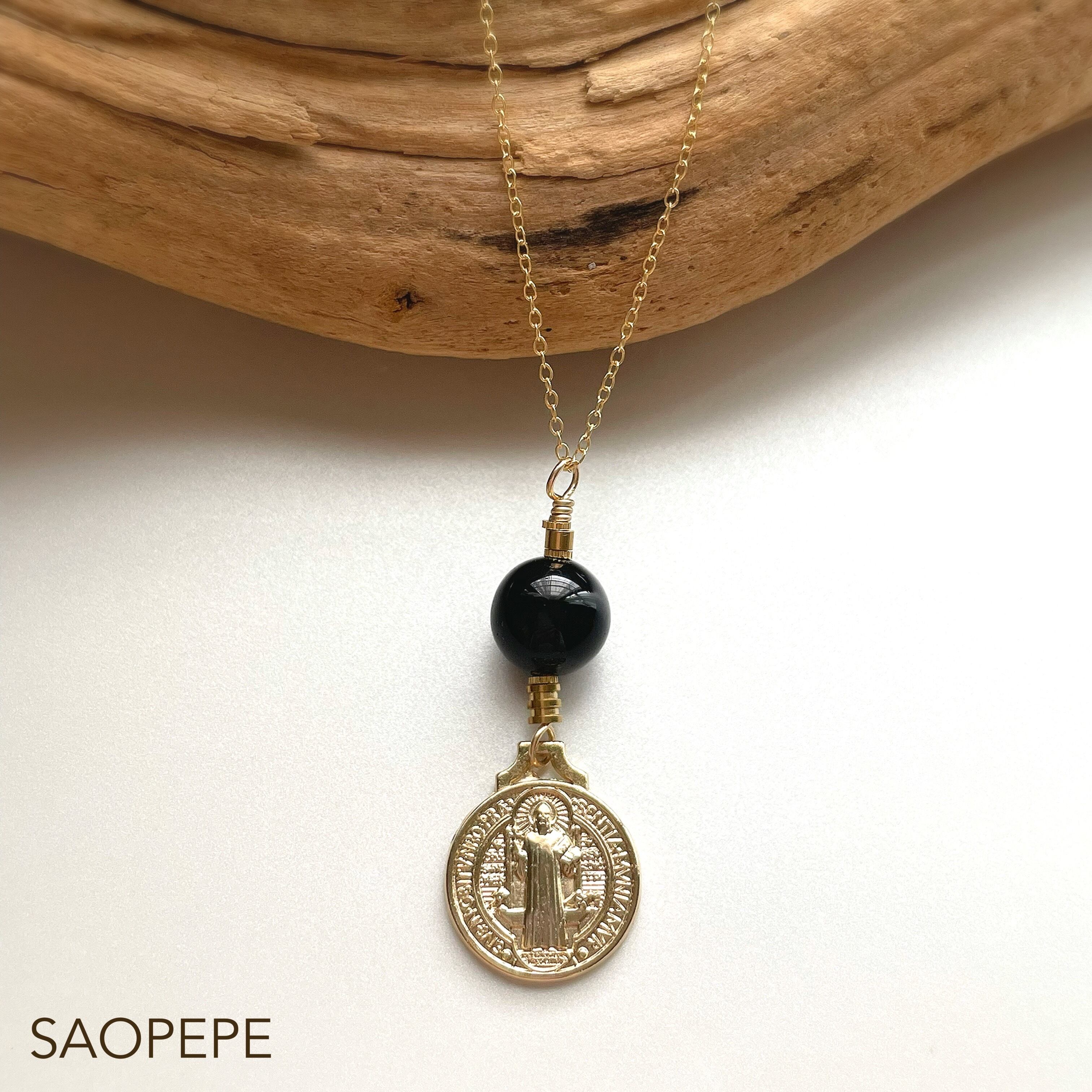 GOLDxBLACKがゴージャスな雰囲気で、存在感のあるメダイネックレスです