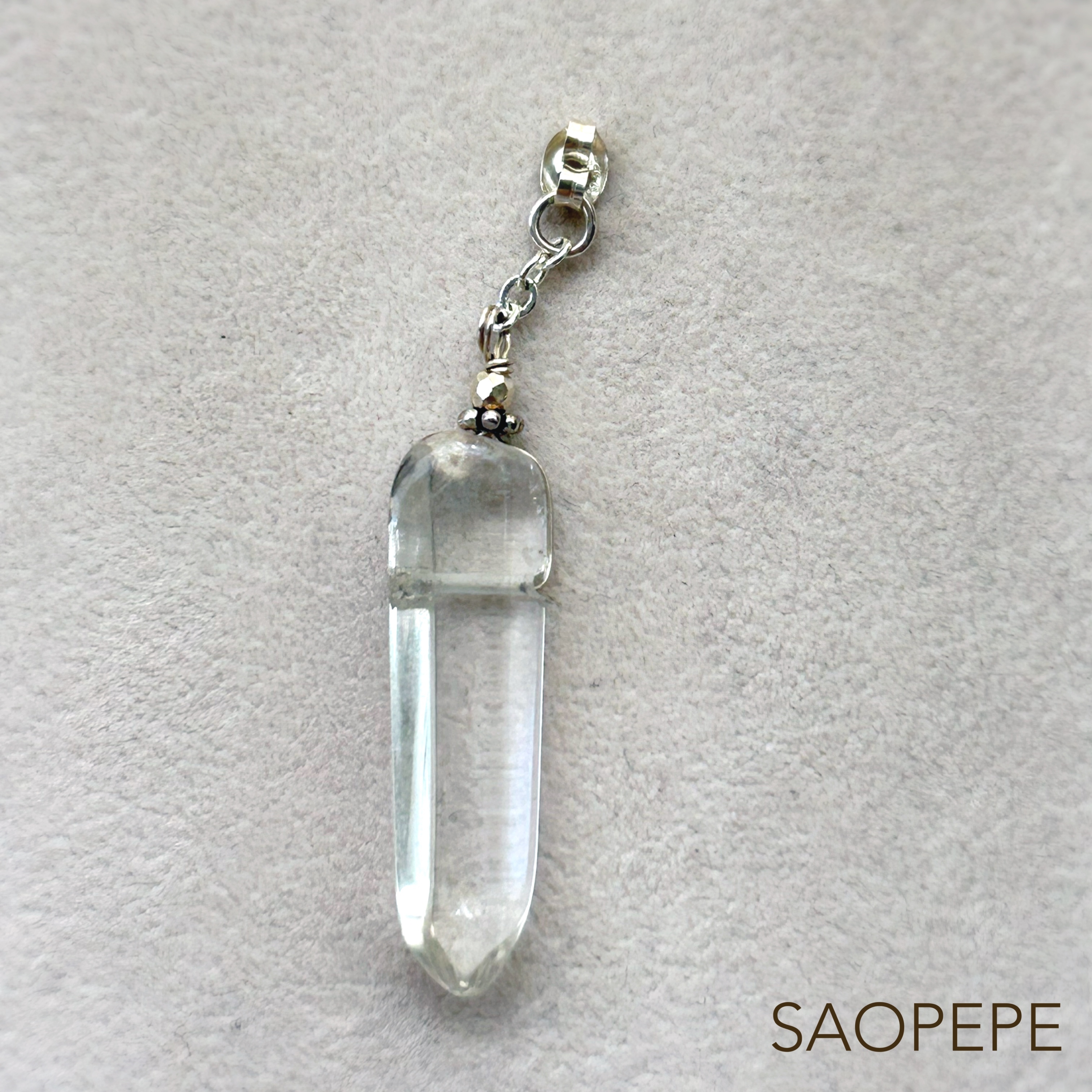 ピアスのキャッチにナチュラルな形の水晶原石ポイントが繋がっています。